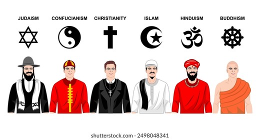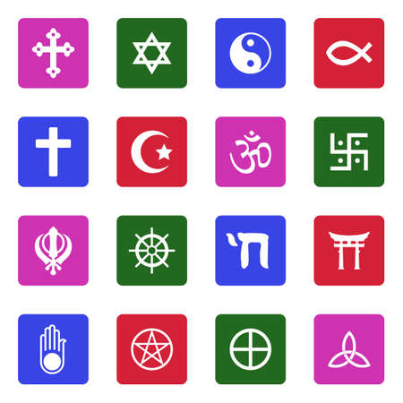 色の世界の宗教シンボル。主要な宗教団体や宗教の兆候。キリスト教、イスラム教、ヒンズー教、仏教、道教、神道、シーク教、ユダヤ教、無神教と英語のラベル付き。イラスト」のベクター画像素材 ロイヤリティフリー2159842853Shutterstock。