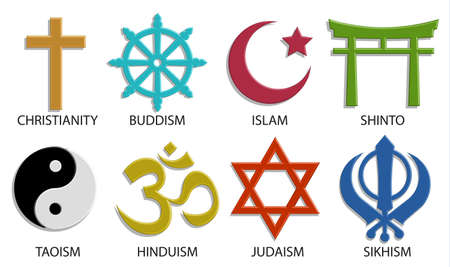 世界の宗教のシンボルの色。主要な宗教団体と宗教の兆し。キリスト教、イスラム教、ヒンドゥー教、仏教、道教、神道、シーク教、ユダヤ教、英語付け。イラスト。ベクトルのイラスト素材・ベクターImage 68416330。