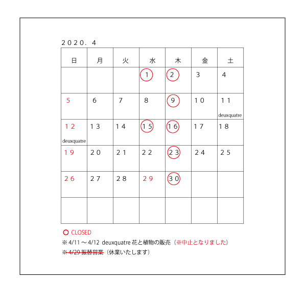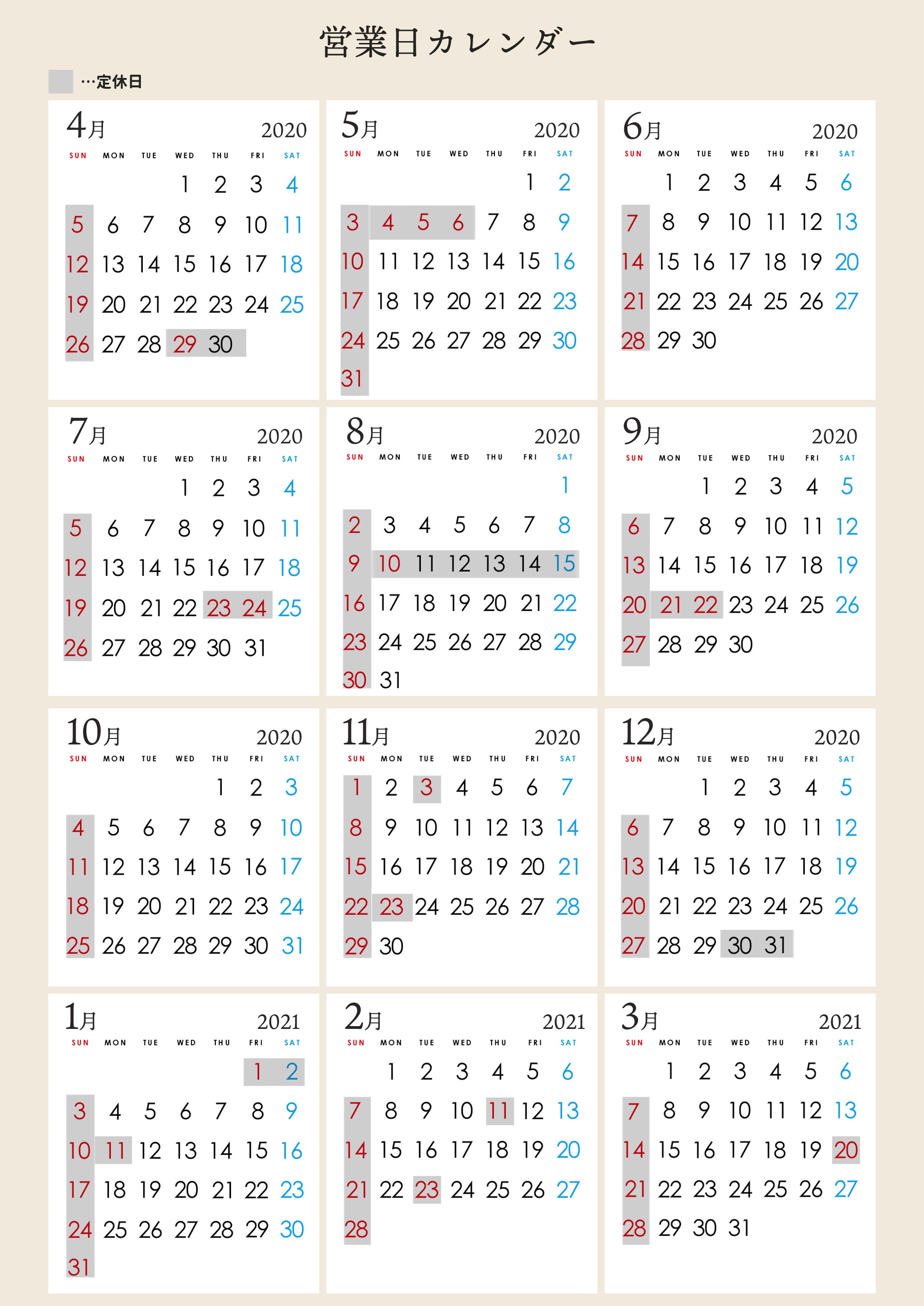 営業日カレンダー 2020年4月-2021年3月カリーニョ。