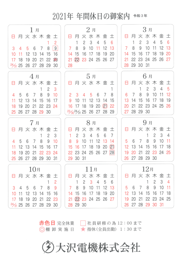 2021年営業日カレンダー大沢電機株式会社 公式サイト。