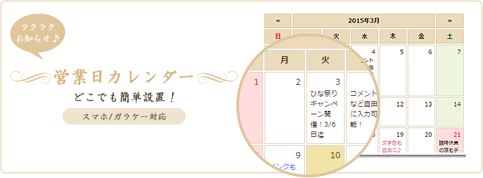 レギュラープランに営業日カレンダー等 機能を追加いたしました!お知らせ・最新情報 カラーミーショップ 集客に強いECサイト構築サービス。