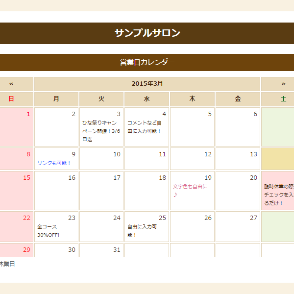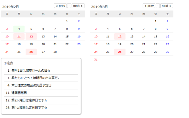 無料:営業日・店休日・定休日カレンダーの作成支援 ネットショップ用カレンダーをプレーンhtmlタグで作成。