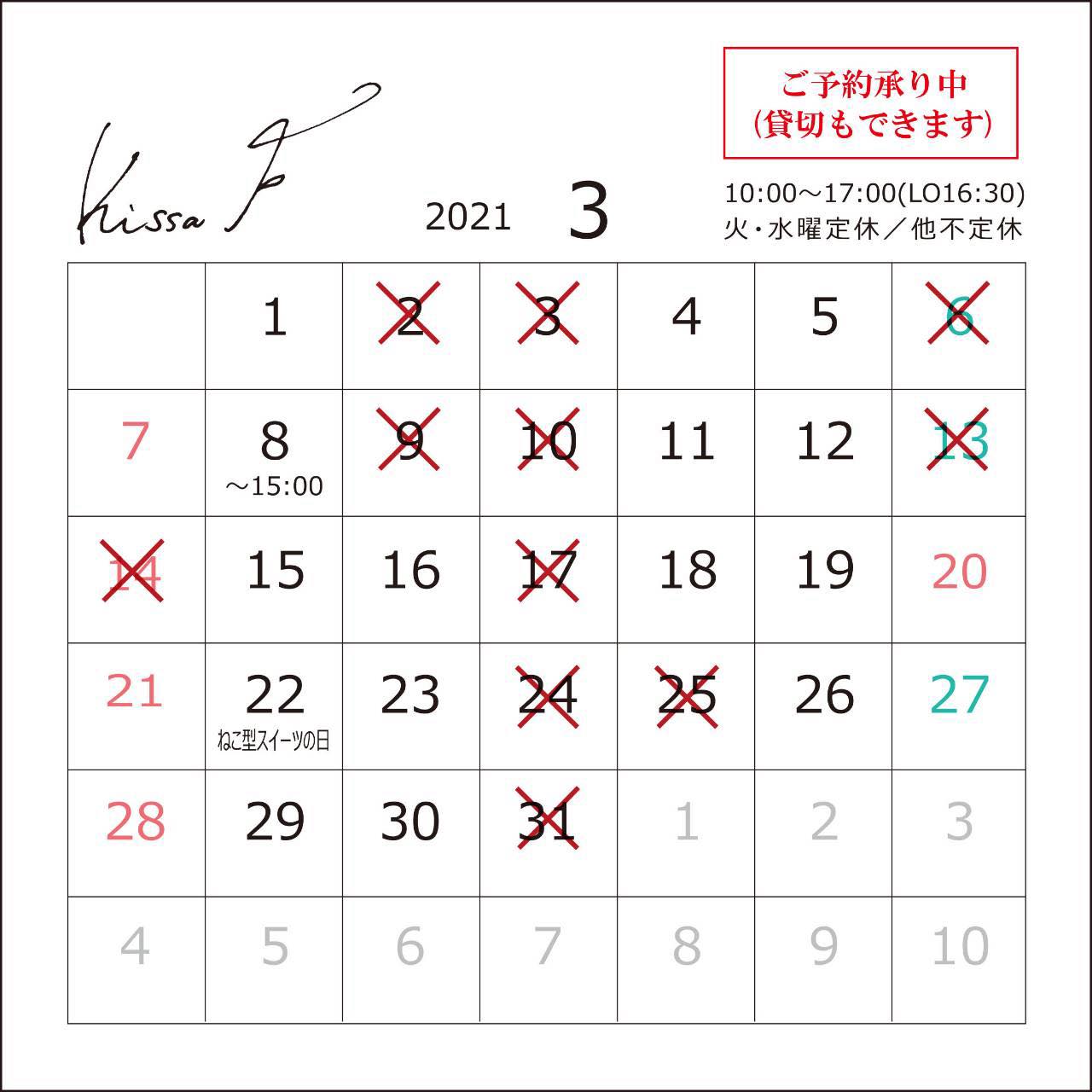 3月の営業日カレンダー 休業日訂正のお知らせ。