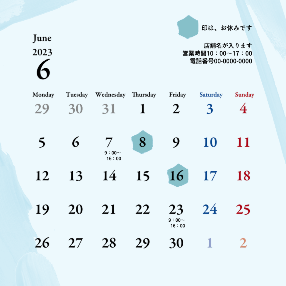 2023年6月・月曜始まりインスタの営業日カレンダーを簡単に作ろう!AdobeExpressのシンプルなデザイン無料テンプレートを配布中 cal018イラストダウンロード。