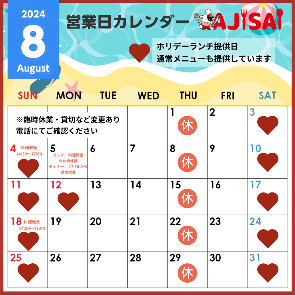 8月の営業日カレンダー - 体にやさしい洋食屋さんAJISAI<アジサイ>。