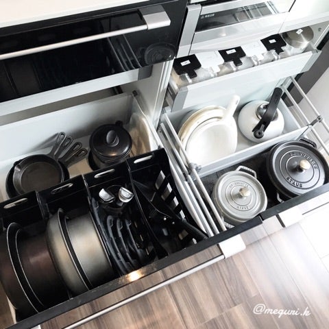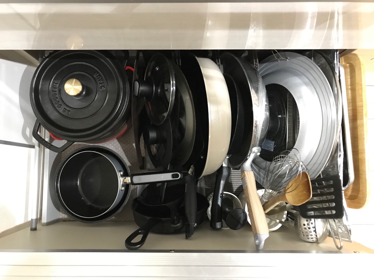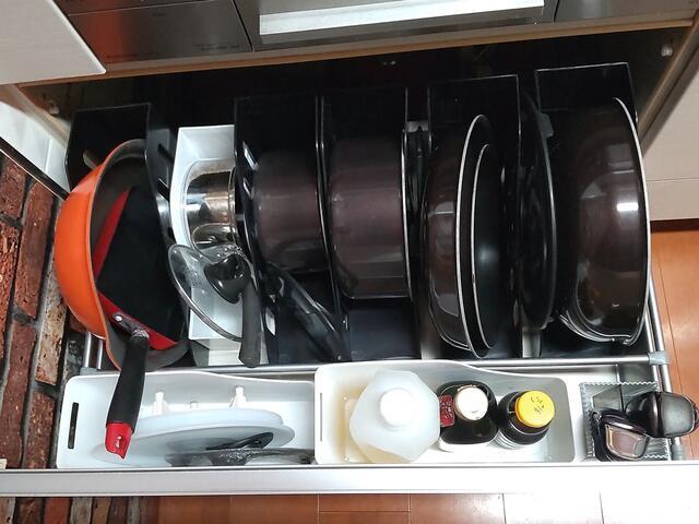 キッチン収納 100均・ニトリ コンロ下引き出しを赤裸々に公開その③ 鍋・フライパンエリアの収納 : Chairs and.インテリアコーディネーター的DIYと暮らしのブログ。