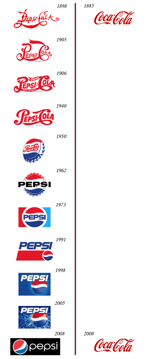 ペプシとコカコーラのロゴの移り変わりを比較した図 - GIGAZINE。