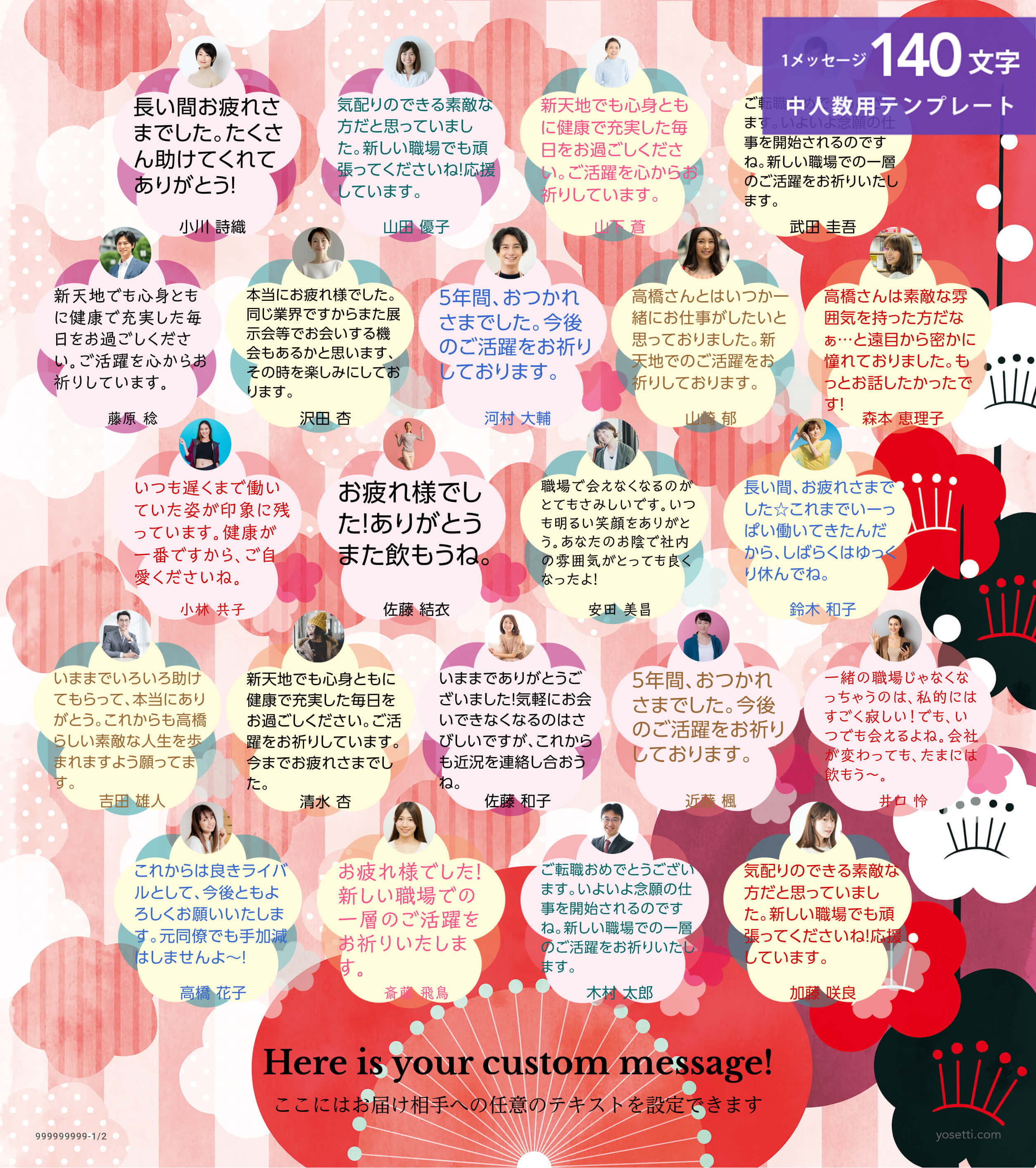 退職祝いをはじめ、多くのお祝いシーンに最適。上司や先輩に向けた寄せ書きデザイン。