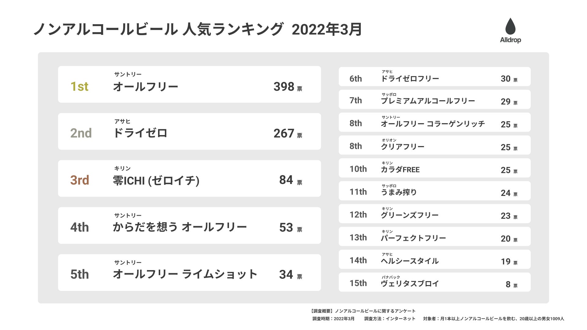 2022年最新ノンアルコールビール人気ランキング調査 半年前に続き人気ランキング1位を獲得したのは「サントリー オールフリー ALL-FREE 」。株式会社LANYのプレスリリース。