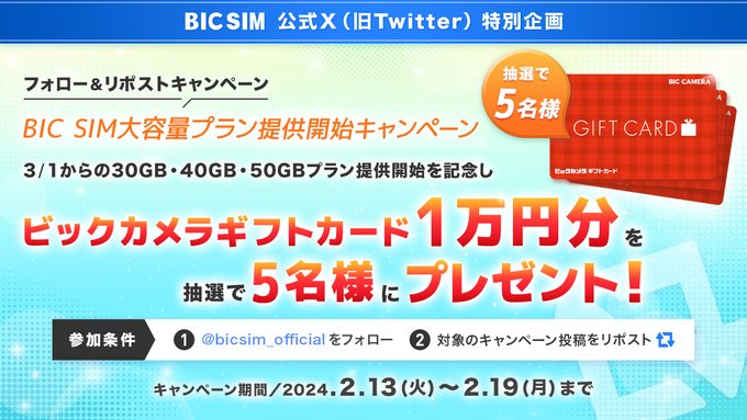 X懸賞 Twitter懸賞ビックカメラギフトカード1万円分を5名様にプレゼント 〆切2024年02月19日BIC SIM。