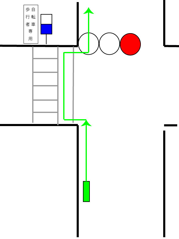 直進したいけど第1通行帯は左折専用レーンで、自転車横断帯&歩行者自転車専用信号機がある場合。ロードバイクが欲しい!初心者向けナビ。