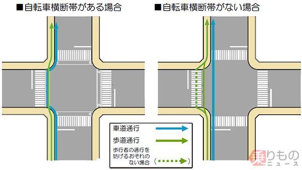 自転車横断帯」がクルマを惑わせる? 横断歩道に併設のアレ、撤去進むワケ乗りものニュース。