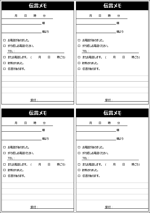 電話メモ・エクセル・ワードの無料テンプレートA4印刷の4分割・4枚セットの素材📑無料ダウンロード!テンプレルン📑無料ダウンロード!テンプレルン。