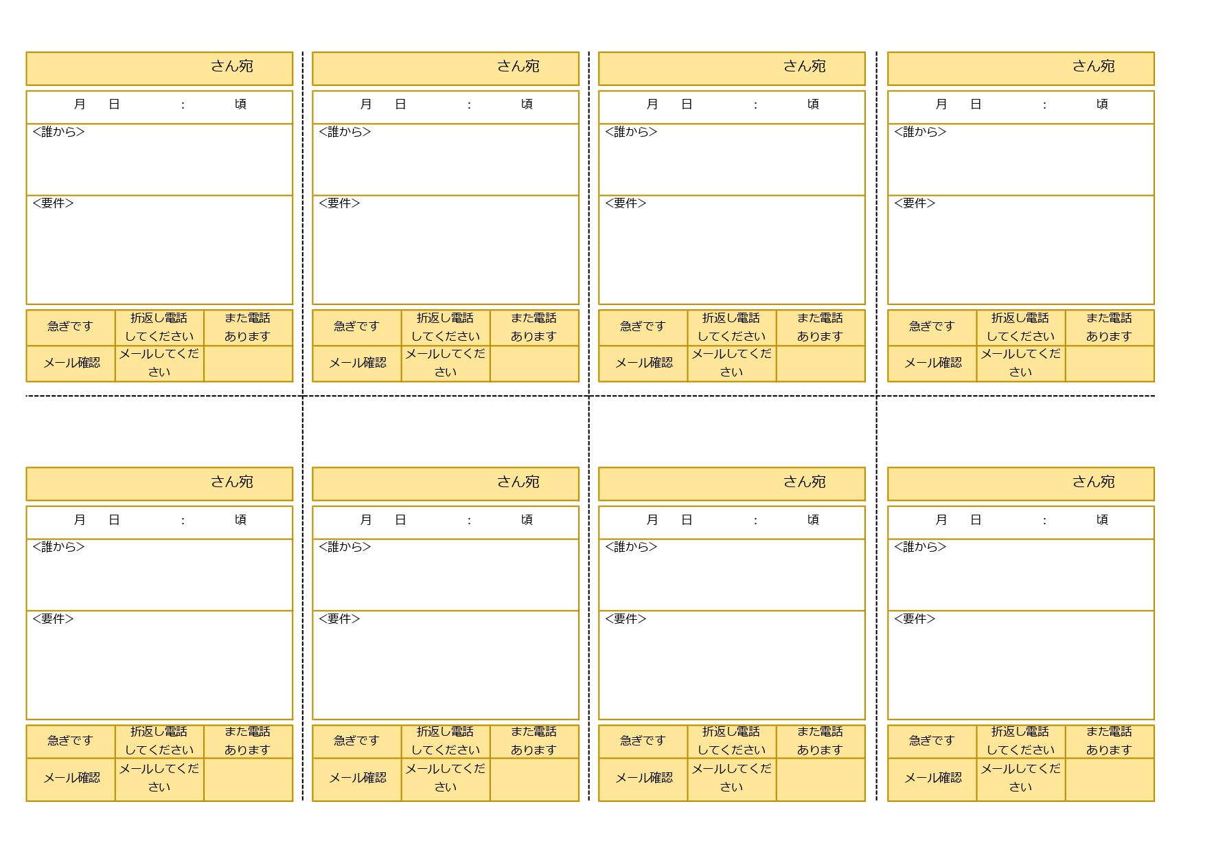 電話伝言メモA4・8分割のダウンロード後にExcel・Word・PDFが使えるテンプレートです。シンプルなデザインですの。