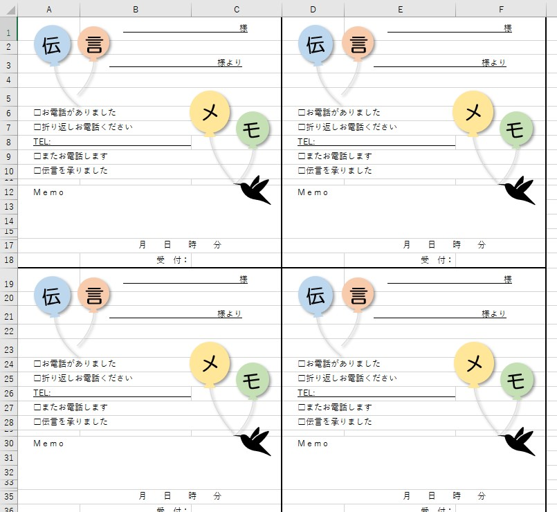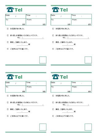 電話メモ・エクセル・ワードの無料テンプレートA4印刷の4分割・4枚セットの素材📑無料ダウンロード!テンプレルン📑無料ダウンロード!テンプレルン。