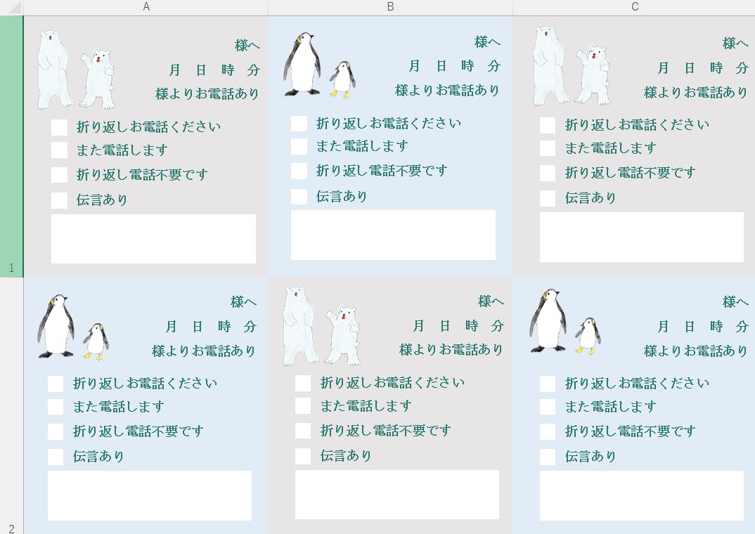 電話メモ 6分割 Excel 無料テンプレート「01593」はペンギンと白熊がかわいい。