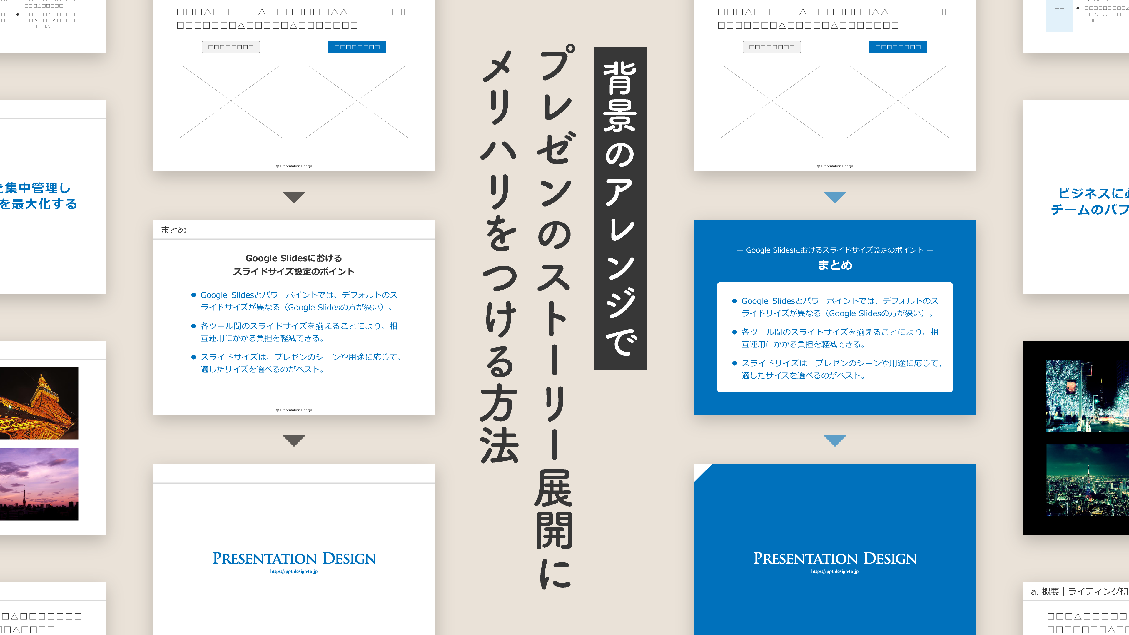 背景のアレンジでプレゼンのストーリー展開にメリハリをつける方法 プレゼンデザイン。