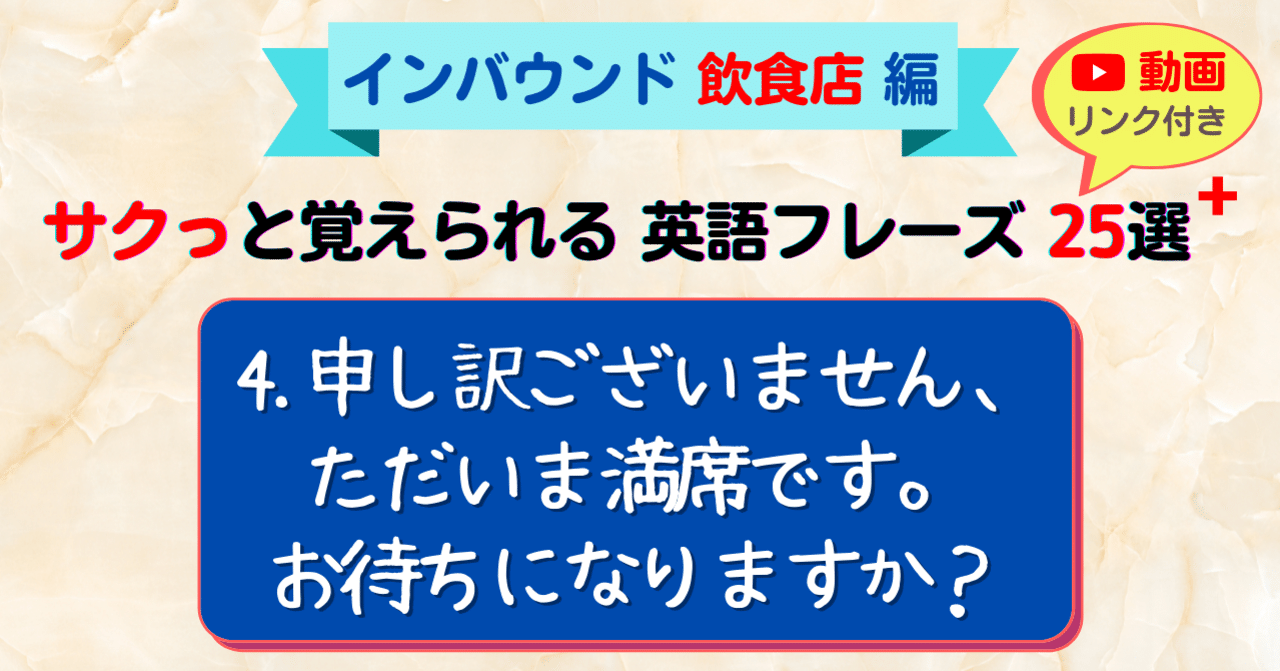 インバウンド対応・接客英語 フレーズ 4. 「ただいま満席です。お待ちになりますか?」→ We are full. Would you like towait?- YouTube。