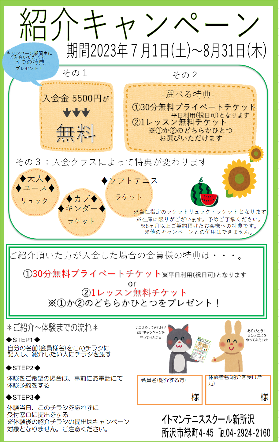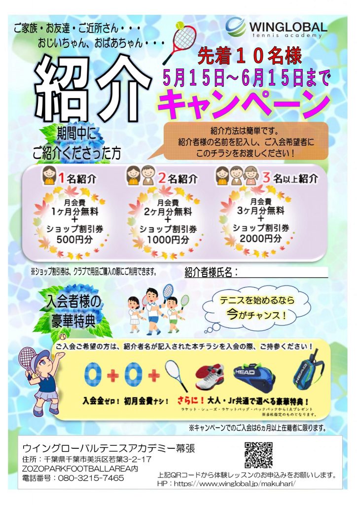 超特大特典 紹介キャンペーン ※先着10名様テニススクールのウイングローバルテニスアカデミー幕張。