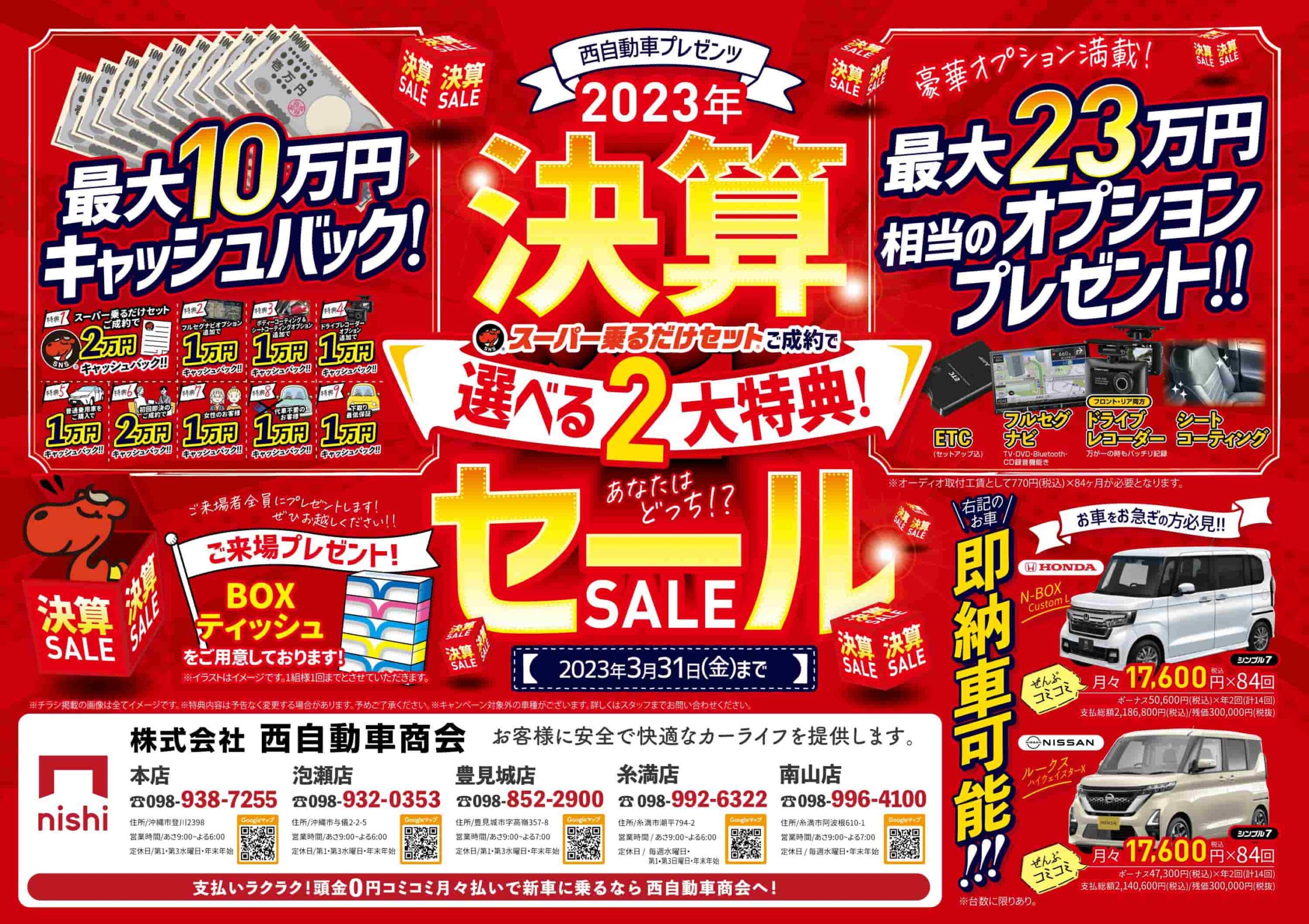 2023年決算セール!!〜選べる2大特典〜 3 31まで 西自動車商会沖縄の新車購入・カーリースなら「乗るだけセット」。