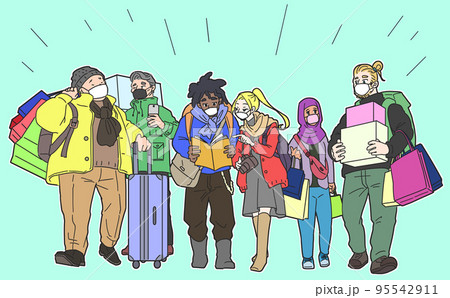 笑顔のインバウンド マスクなしVer ツアーガイドを先頭にワクワクが止まらない様子の外国人観光客のイラスト素材93719173- PIXTA。