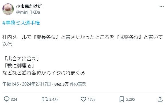 社内メールで「部長各位」→「武将各位」と間違って送信 ノリの良い上司たちのエピソードが話題にまいどなニュース。