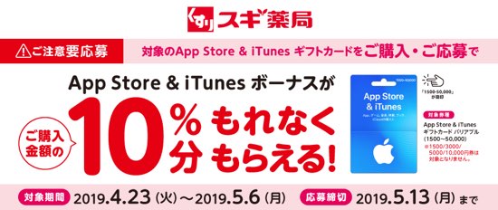 2019年5月6日まで スギ薬局グループでApp Store & iTunes ギフトカードバリアブルを購入・応募すると10%分のボーナスコードがもれなくもらえるキャンペーン実施!iTunes Card 割引販売速報。