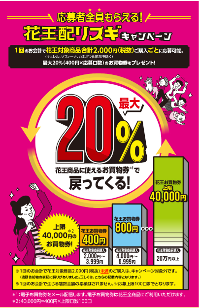 スギ薬局花王配りスギキャンペーン、花王商品2000円購入で、最大20%分の花王お買い物券が貰えます。4 30まで。