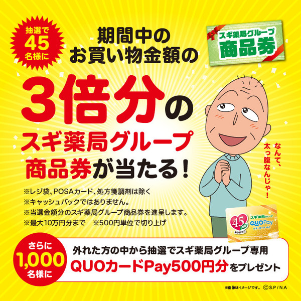 スギ薬局45周年 お買い物金額が3倍になって戻ってくる!?「まる子とスギ薬局アプリ3周年記念祭!」の巻 開催!最新情報ちびまる子ちゃんオフィシャルサイト。