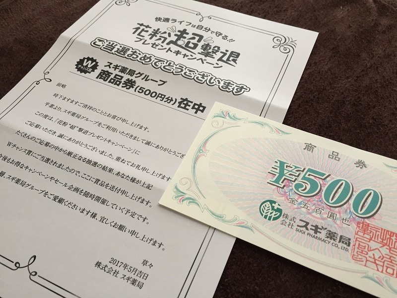スギ薬局のアプリ懸賞で「商品券 500円分」が当選しました♪懸賞主婦懸賞で生活するブログ。