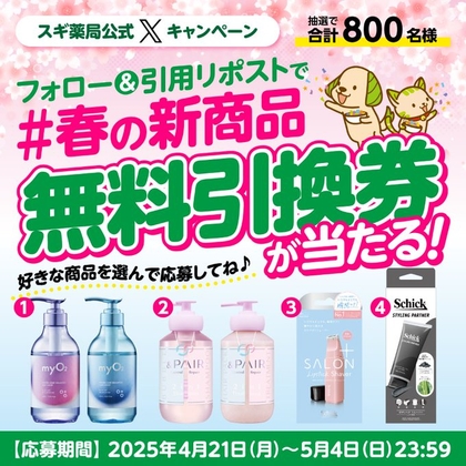 X懸賞 Twitter懸賞春の新商品無料引換券を合計800名様にプレゼント 〆切2025年05月04日スギ薬局。