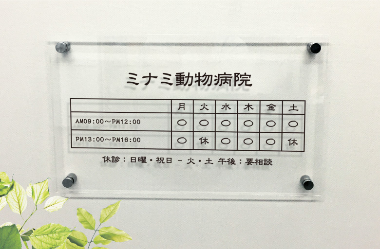 診療時間案内プレート 透明アクリル 化粧ビス止め H300×W500×t5mm 診療案内看板 案内サイン 病院 医院 クリニック 接骨院 歯医者 屋外おしゃれ エントランス 病院の看板 アクリル看板 clm-ta-sp-35。